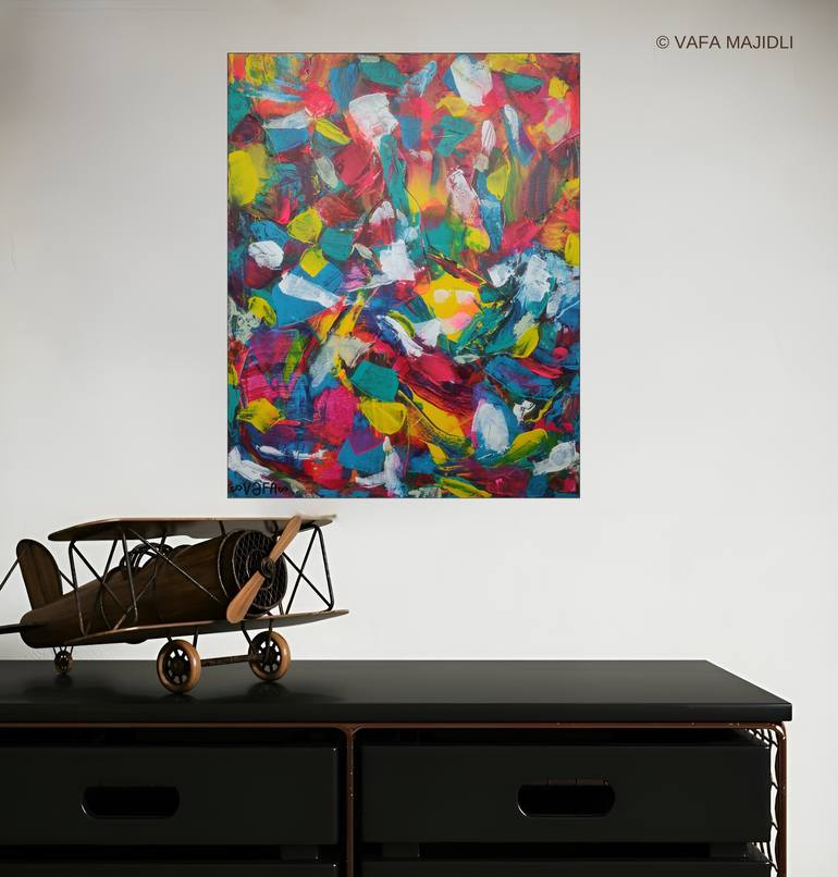 "Summer Vibrations" is a captivating abstract expressionist masterpiece that bursts with vibrant energy and dynamic movement. This compelling artwork features bold, textured brushstrokes applied with an impasto technique, giving the surface a rich, three-dimensional quality that invites viewers to e...