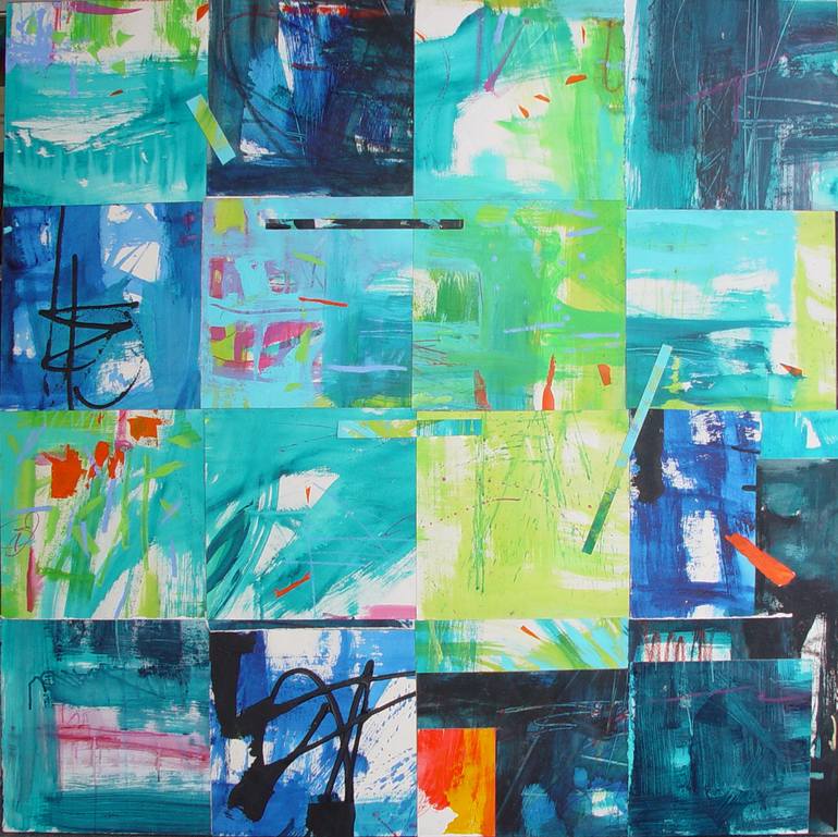 acrylic abstract painting on paper mounted in grid format on plywood, covered in acrylic mat medium