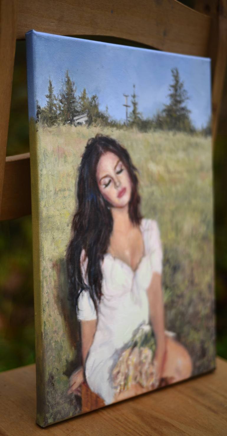 Lana Del Rey in white dress and her hair loose relaxing sitting in summer meadow holding flowers.