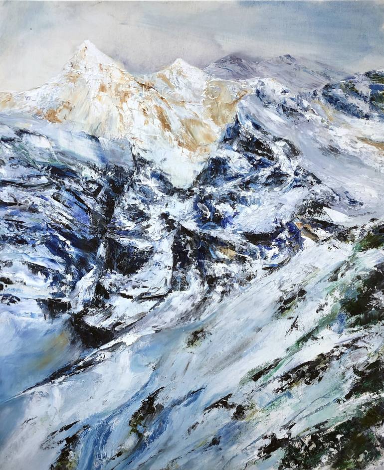 Original mixed media painting of a winter mountain landscape inspired by the majesty and quiet strength of the mountains. This textured impasto artwork has jewel tones and is composed of oil paint and wax on wood panel. Signed on back. Ready to hang. Includes a Certificate of Authenticity.