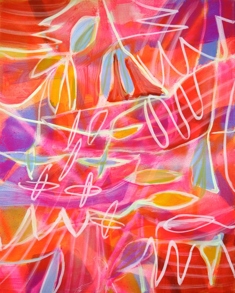 "Sun 3 (Water)" is a modern, abstract landscape composed of simple lines and forms found in nature. Bright pinks and reds layer over blues and yellows to create a sense of depth and energy. It's signed on back, wired and ready to hang. It ships in a box.