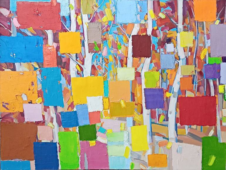 Original oil over acrylic underpainting on canvas. Abstract landscape painting stretched on a supported wooden frame. Clear bright colors on a sunny day of Autumn. Sky shimmering through yellow and red foliage. During autumn, the forest is painted with fall colors and sunlight shines through the f...