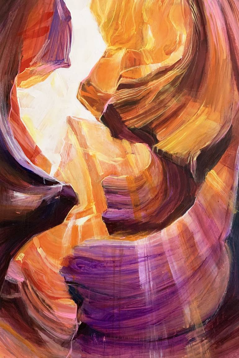 Sun in curves. Unvisited series: USA, Acrylic paints and marker on a canvas, 60x90cm A play of sun rays and shadows among the winding walls of the Antelope Canyon. This artwork was painted on a linen canvas and is expected to be shipped rolled in a tube. But if you want it to be stretched on a wo...