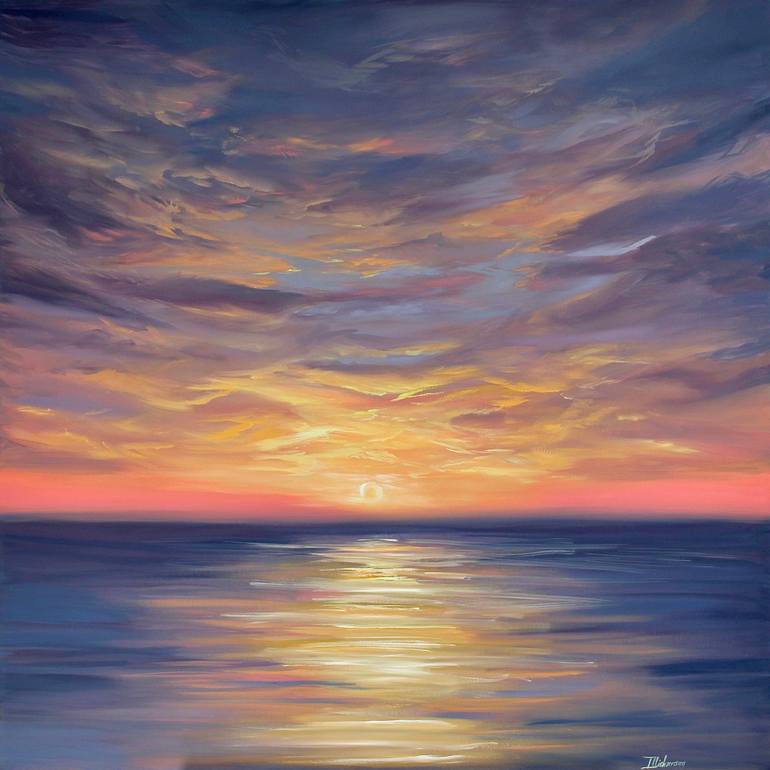 "Sun's Last Glimpse" is an oil painting on stretched canvas created by Liza Illichmann in 2023. This artwork is inspired by the beautiful moment when the sun meets the ocean at sunset, and depicts a serene scene with purple and orange hues. Illichmann's use of color and light captures the tranquil ...