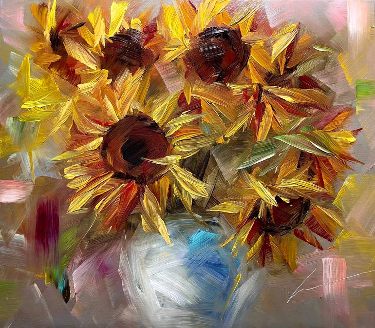 "Sunburst Symphony" is an enchanting artwork that captures the essence of sunflowers in a vase with expressive and dynamic brushstrokes. The painting bursts with vibrant colors, reflecting the golden rays of the sun and the lively spirit of these magnificent blooms. The vase painted with bold strok...