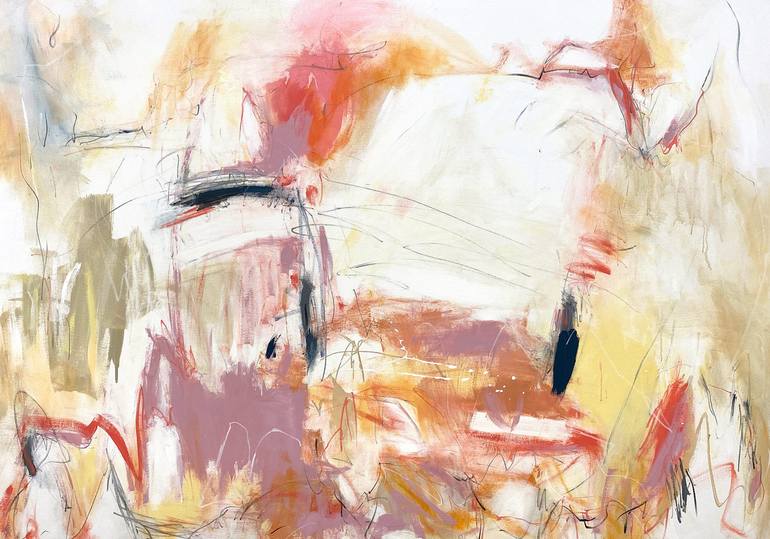 'Sundance' is an original oversized statement painting by Cheryl Harrison. This large painting has areas of texture and a subtle palette of beige, white, black, apricot, orange, sage, grey with bold rhythmic marks in paint and pencil across the canvas surface. It is acrylic on un-stretched canva...