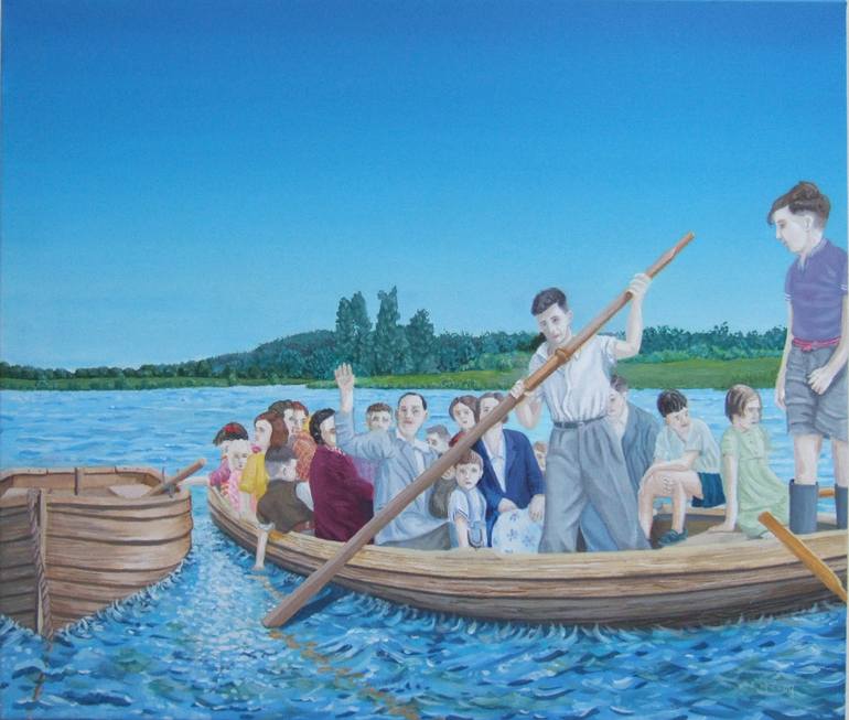 Sunday boat trip to Barton in Fabis from Attenborough, East Midlands England circa late 40s. Oil on medium grain stretched canvas with sides painted as part of the scene. Finished in a soft sheen varnish to avoid glare from lighting. Slim line stretched canvas Strung and ready to hang