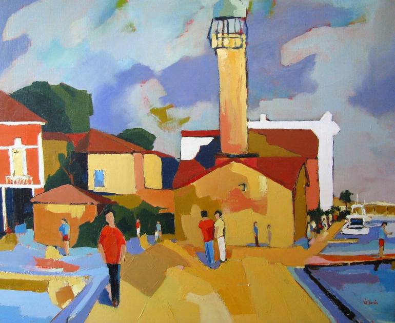This original oil painting on a linen canvas captures a tranquil Sunday afternoon in Le Grau du Roi, a famous resort and fishing harbor in the South of France. The artwork presents a view of the right bank looking inland, featuring the iconic old houses and lighthouse that lend the town its timeless...