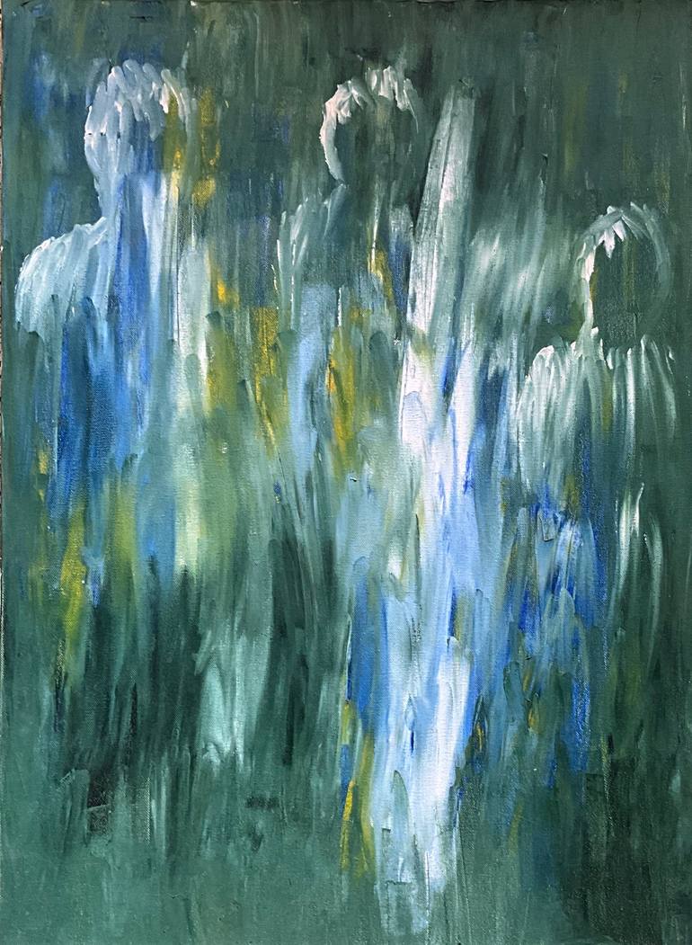 “Sundered” drifts like a memory half-formed, a sea-green dreamscape awash in waves of translucent depth. Three pale figures—spectral, weightless—hover in the liminal haze, neither here nor there, suspended in the rippling void. The white streak, unplanned yet inevitable, split them apart, carving th...