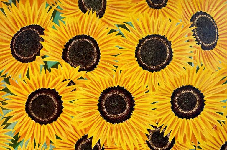 This painting by Douglas Figueroa Gordon features a vibrant and immersive composition of sunflowers. The artist has skilfully arranged numerous large sunflowers in full bloom, filling the entire canvas with their golden-yellow petals and dark brown centres. The repetition of the sunflowers creates a...