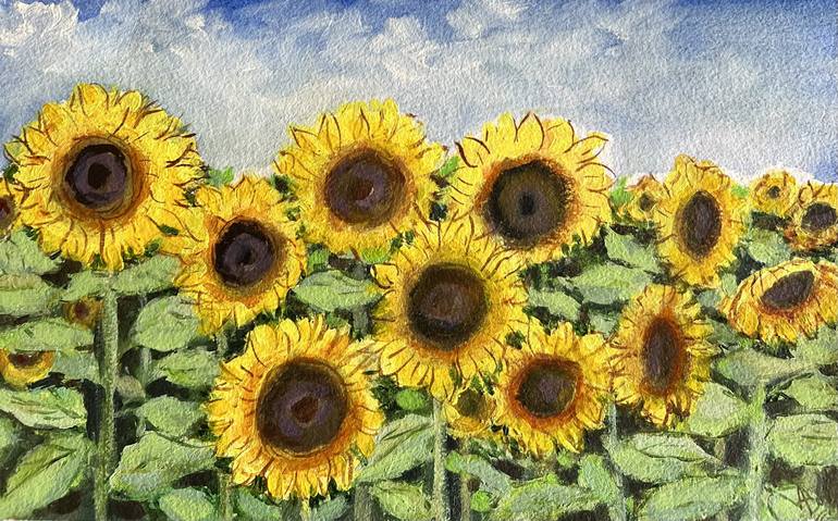Sunflowers field on a bright sunny day. Painted loosely in impressionist style on Indian handmade deckled edge paper. You are welcome to get in touch with me to have a custom-made painting, especially for you. PS — I reuse the packing materials wherever possible. Rest assured, your painting wi...