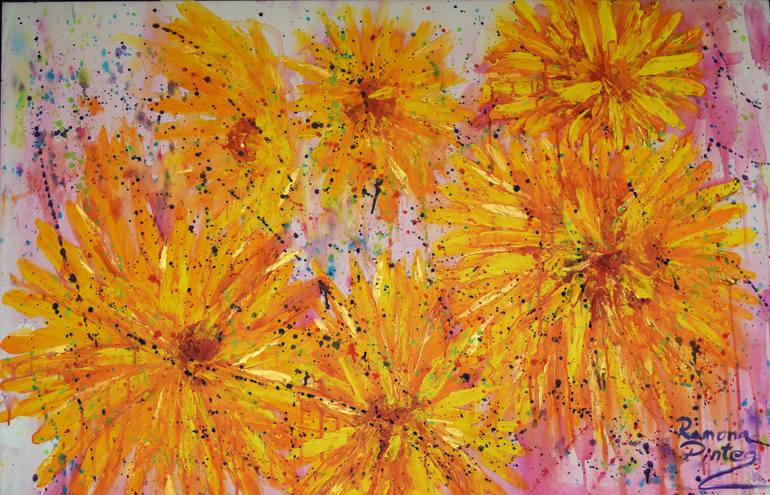 This was painted on a very hot summer's day looking at some beautiful sunflowers I received as a present. I decided to change the shapes and not paint the sunflower as it is in reality but to bring in the joy and burst of color instead. This painting doesn't require a frame, it is ready to hang.