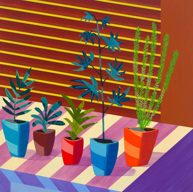 This is one of four 24 x 24 acrylic paintings that make up a series titled "Sunlight Suite" The set of originals is available above. Hard-edge shapes and light through wooden blinds play across art books on a bookshelf. Flattened space and forced perspective are issues I play within my work.