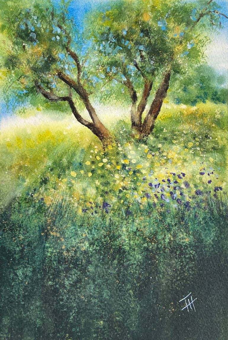 It was spring in Spain, all the meadow flowers were out and the sun was shining and sparkling through the tree branches. It was so beautiful. I love painting these kinds of scenes as they always recreate and take me back to those peaceful and magical moments. · Artwork size 21cm x 30.8cm with a whi...
