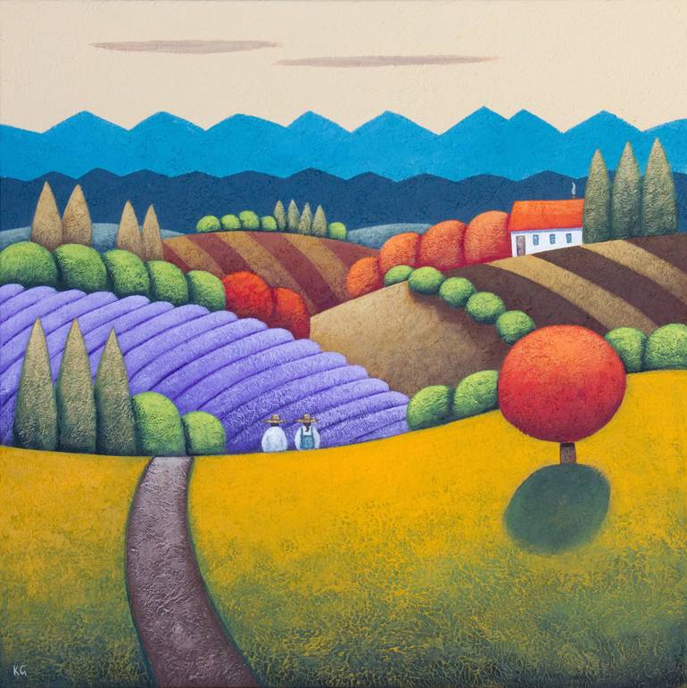 Sunny Days No.3 by Kate Graham. This square scene features rolling fields of lavender and lush green grass, trees and a single country house with two farmers walking along the path. Mountains in the background underneath a yellow sky. With an under-painting of texture, this piece is given dry-brush ...