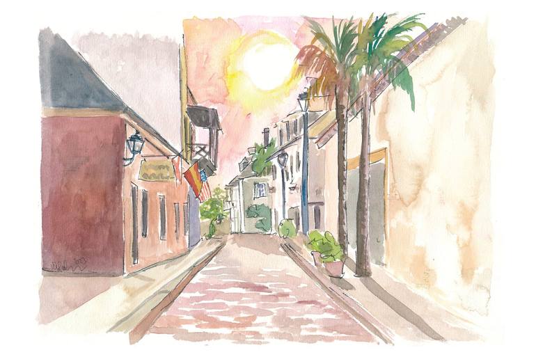 Sunny Street Scene in St. Augustine Florida USA - watercolor on paper