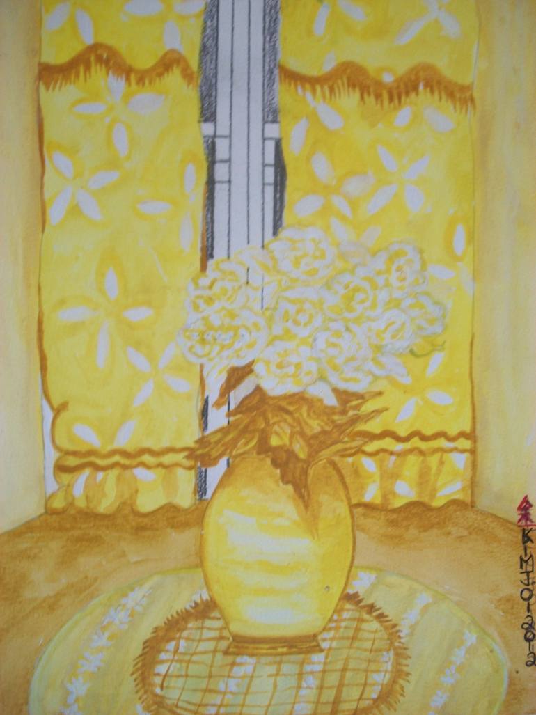 I painted with just yellow water color to capture 60"s Living Room with yellow curtains, vase, carpet and flowers. I hope the viewers will feel and think nostalgic, sentimental emotions towards the painting--taking them back to years gone by, certain fondness.