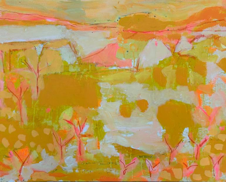 This is one of my smaller sunshine paintings. The rolling hills in this scene are inspired by my beloved French countryside, captured on a radiant summer morning. I chose to emphasize the warm yellows and soft pinks, letting them take center stage while leaving out the surrounding bursts of color. T...