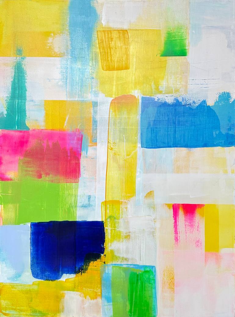 One of the artist's earlier works. 'Sunnyside' is bright, vibrant, and energetic. Acrylic and gouache on canvas. Work is not framed but sides are painted and canvas can be hung as is. Can be oriented horizontal or vertical.