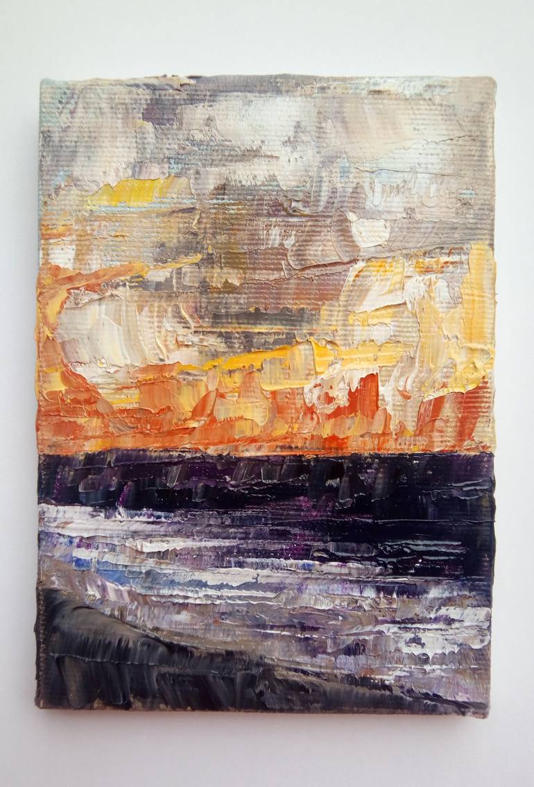 Painting is oil on canvas. It shows a rather intense sunset seen from the beach and the dark sea.