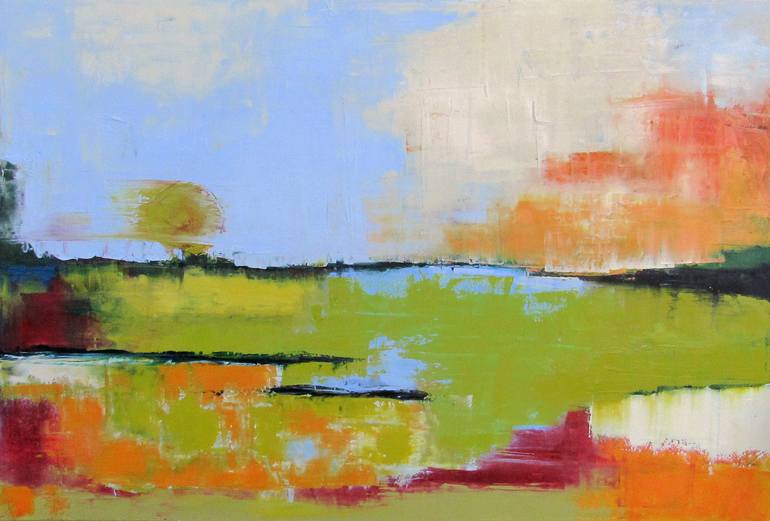 Oil painting of the sun reflecting on the meadow in the countryside. Sides painted black and ready to hang.