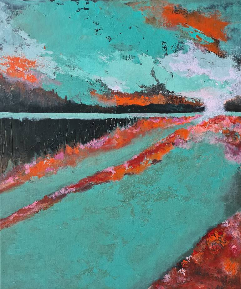 Original Abstract Painting of Sunrise and Horizon with Mentha - Orange Paletta. Comes ready for hang, Italian Cotton canvas wrapped around the wooden frame, painted around the edges to compliment the artwork and doesn't need framing.