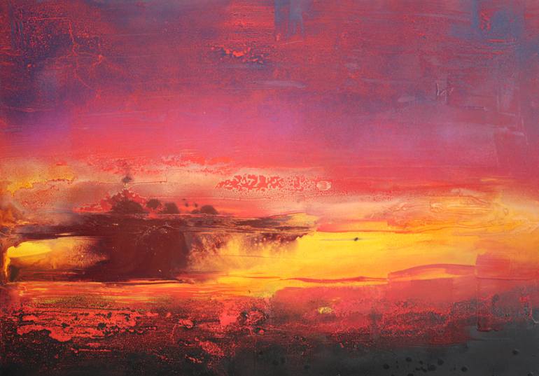 Abstract landscape including vivid colours, purple, reds and yellows. One can imagine a bay.