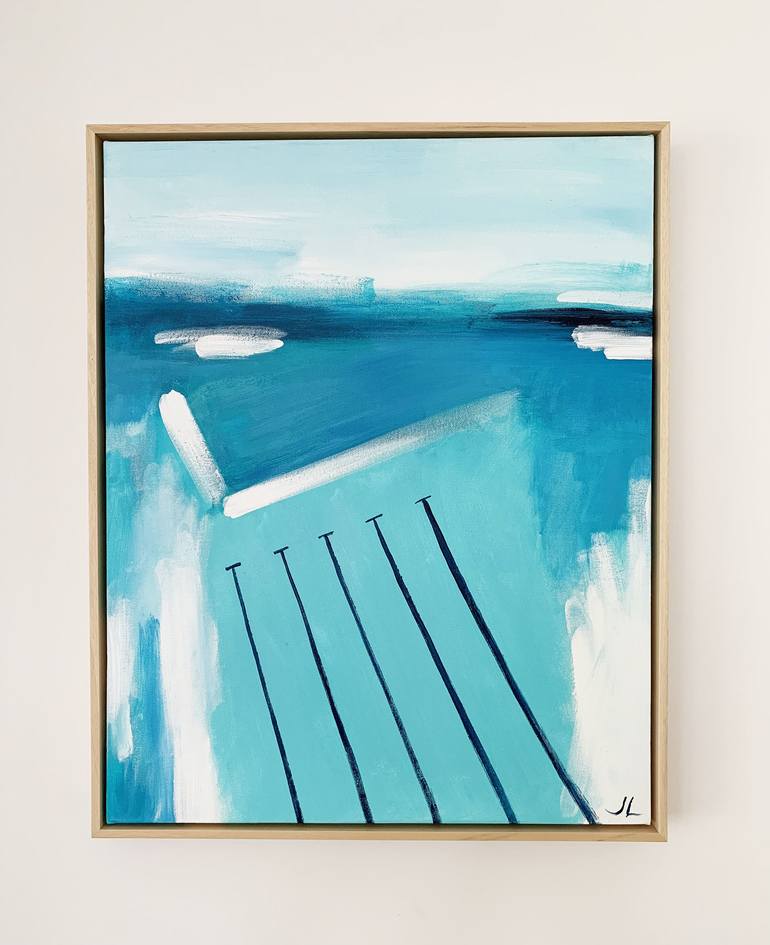 Original Acrylic on canvas. 4cm gallery wrap edge. Framed in Tasmanian oak. 65cm x 80cm An ode to the beauty of Bondi Icebergs. Fresh bright blue waves sit alongside the crisp aqua of the pool on a beautiful Summer’s day as the sun melts into the horizon. Jennifer's signature piece takes on a new ...