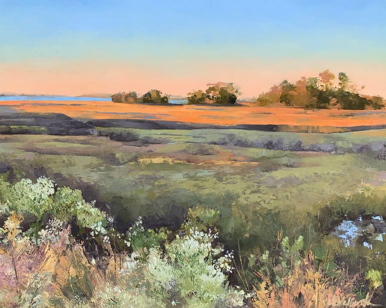 Painted with a palette knife, this painting captures the last minutes of sunlight falling across the marsh at Riverfront Park in Mount Pleasant, SC.