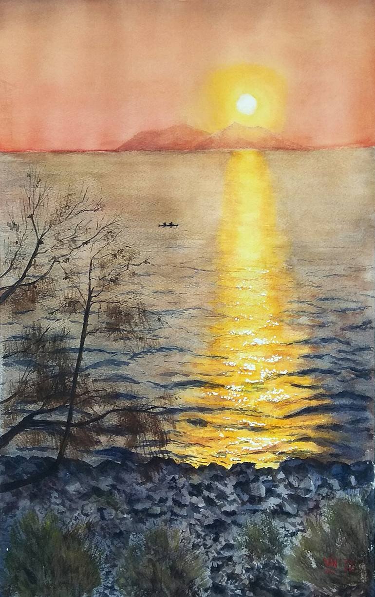 Sunset overlooking the island of Sazan in Albania. The work is done on 100% cotton paper.