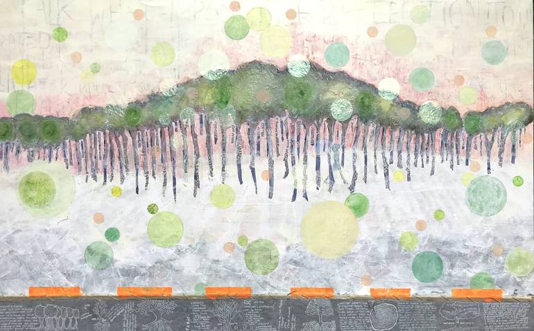 In this painting the spectator is a witness of the sunset. The sun slowly sets behind the trees near the sea in the of south France leaving a pink glow shining through the Pine trees along the highway. The painting is made in acrylic paint with medium, pigments and a collage of paper was used for th...