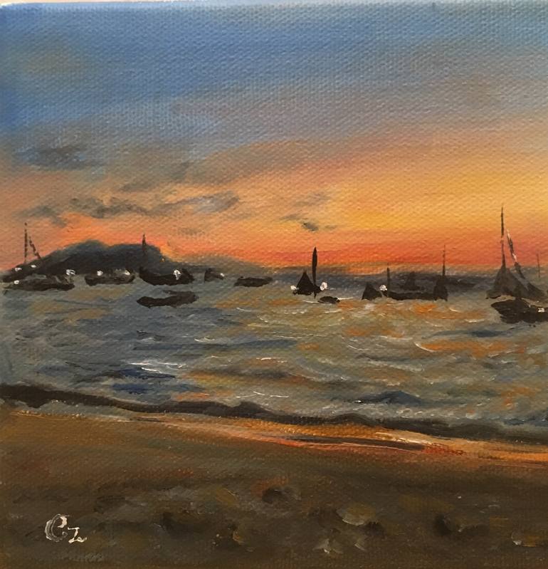 Sunset at Boracay,It was one of my vacation at Philippine.Boracay has beautiful Long Beach,I love to see the sunset there,It was beautiful color reflected on the surface of the sea.I painted it with oil on the canvas.