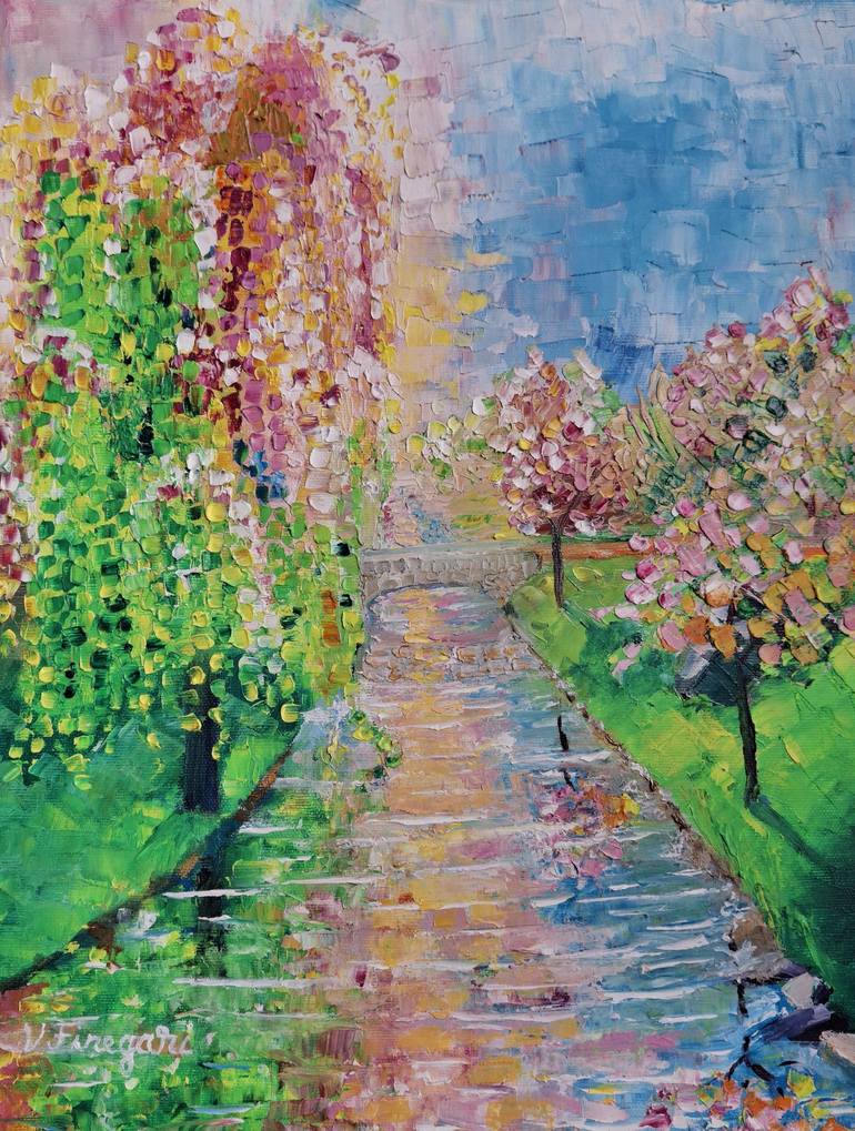 One of a kind impressionistic, oil on canvas painting, made with palette knifes and portraying the beauty of a spring sunset by lazy river.