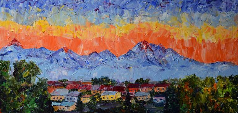 Sunset mountains is a beautiful big artwork in bright and contrast colours. Free brush and palette knife work, expressionistic impasto style, but still maintaining the vivid and accurate image of the landscape. This painting is original, authentic, one-of-a-kind, 100% hand painted. Created using oi...