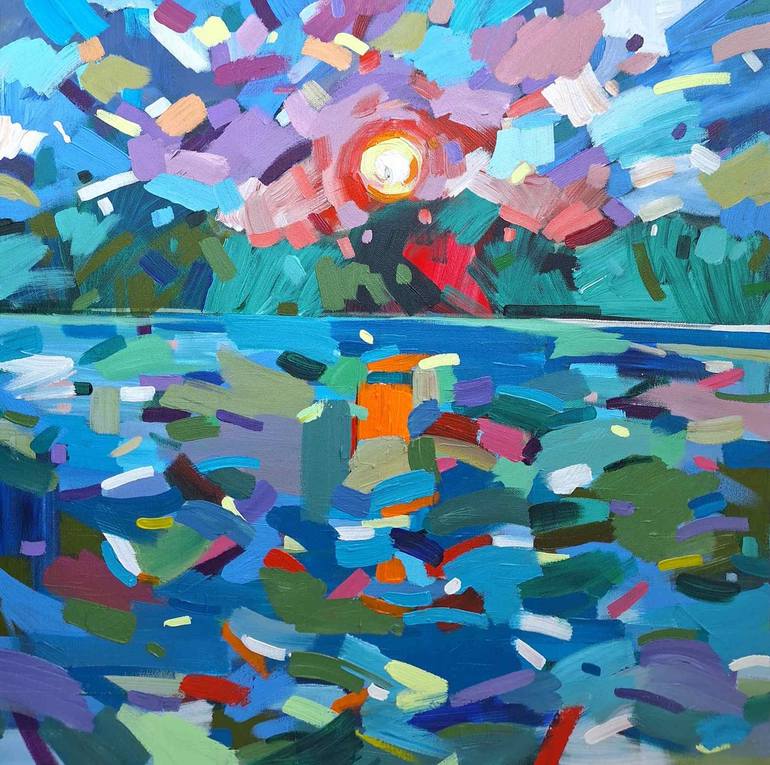 This captivating abstract painting captures the essence of a radiant sunset reflecting over calm waters. Layers of bold, expressive brushstrokes in shades of blue and green depict the shimmering water, while warm hues of orange, red, and yellow create a glowing focal point for the setting sun. The s...