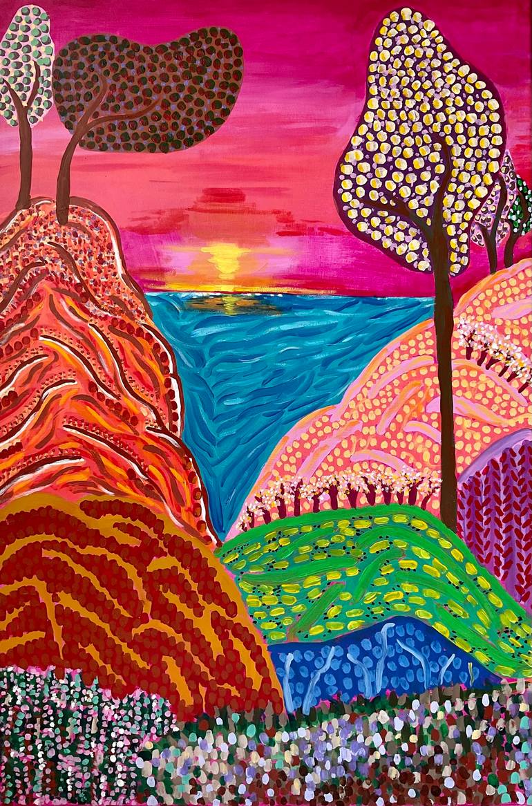 Sunset over the hills. Jewelry-like glamorous trees and hills. Acrylic and oil pastel on canvas varnished and signed by artist.