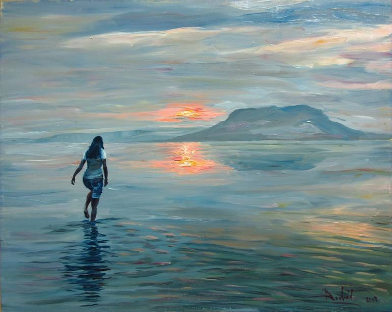 Woman walks on the beach in shallow water at sunset. Material: oil, wood