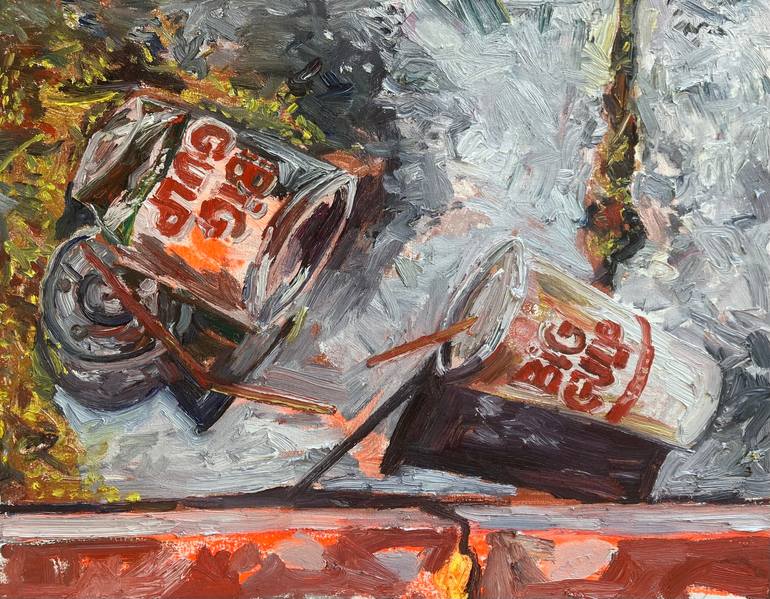 Oil painting of an empty Super Big Gulp and Big Gulp in gutter. Oil and Oil Stick on Canvas.