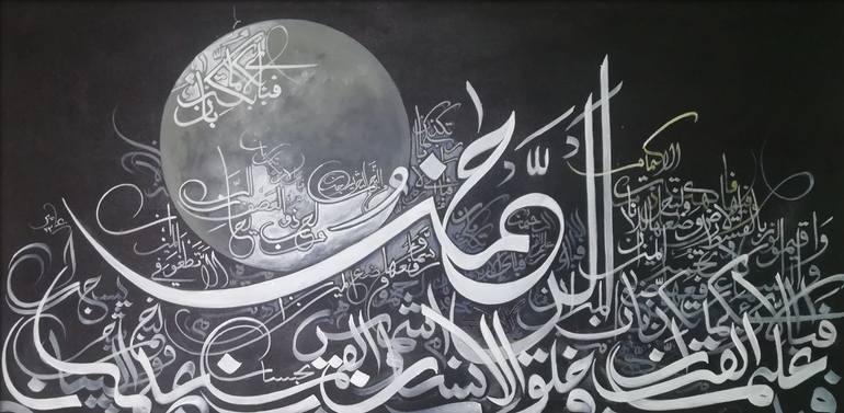 Surah Al-Rahman in Black & White My soul is poured onto canvas, whispers of Surah Al-Rahman dancing in every stroke. A 60"x30" acrylic masterpiece, it's not just art, it's an ethereal experience in black and white. This one-of-a-kind creation is seeking a home where its beauty can resonate and i...