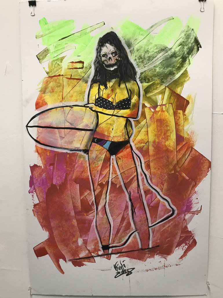From the "All My Friends Are Monsters" series. I like the juxtaposition of the female form wearing a skull mask while surfing. words like premonition, life & death, and clash should be explored while looking at this work