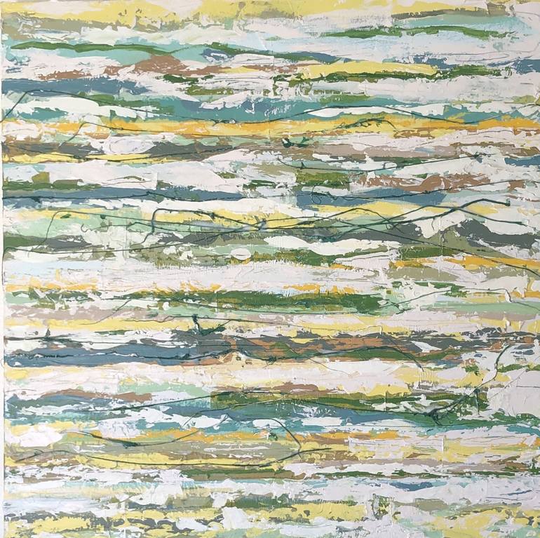 Surface horizon is a collection of paint, pushed and pulled, with added bits of deconstructed yarn, rice paper, and raffia. Thick, painterly layers reveal depth and texture.