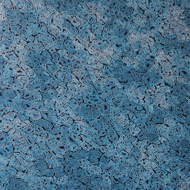 This artwork describes a shimmering tropical water surface seen from above. It is an original painting due to a particular technique, the color is not applied with brushes, but with bottles filled with acrylic paint. Each color was created individually. The painting is signed on the back and has a c...