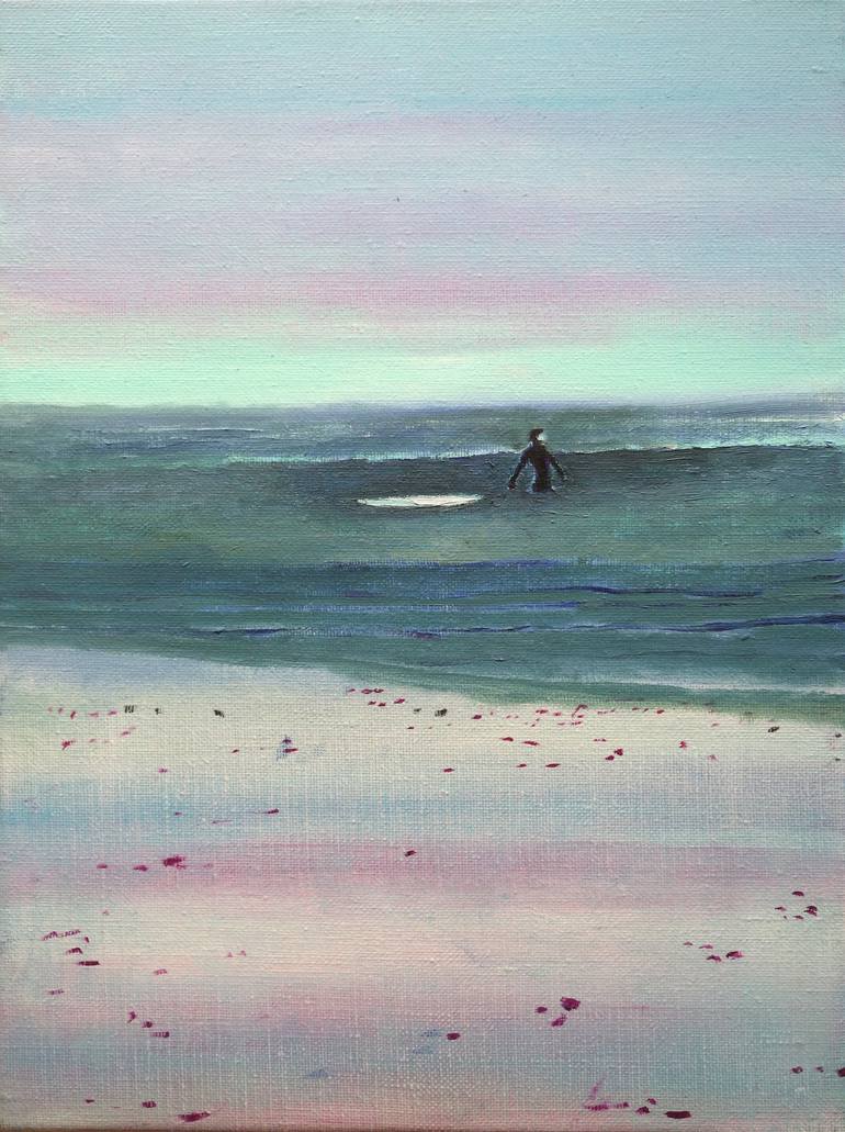 This artwork depicts a tranquil beach scene, featuring a lone figure standing in the sea. The horizon, blending soft pastel tones of pink, blue, and green, creates a soothing atmosphere. The water is painted with layered hues of greens and blues, capturing the undulating waves with subtle brushstrok...
