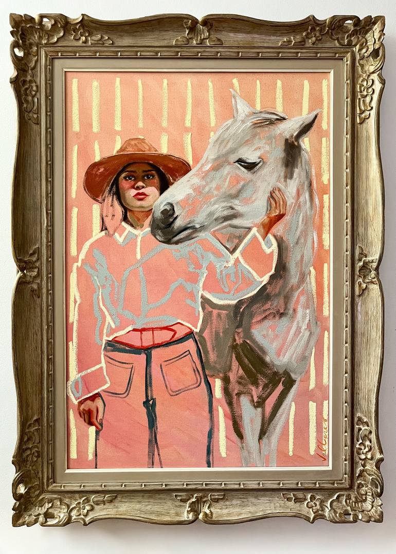 Sutton captures the eternal bond between a young woman and her horse, a relationship woven with trust, freedom, and love. Painted in soft pastels—rose and butter-yellow lines—the work reflects the tenderness and power of girlhood passions carried into adulthood. The horse becomes a mirror of the sel...