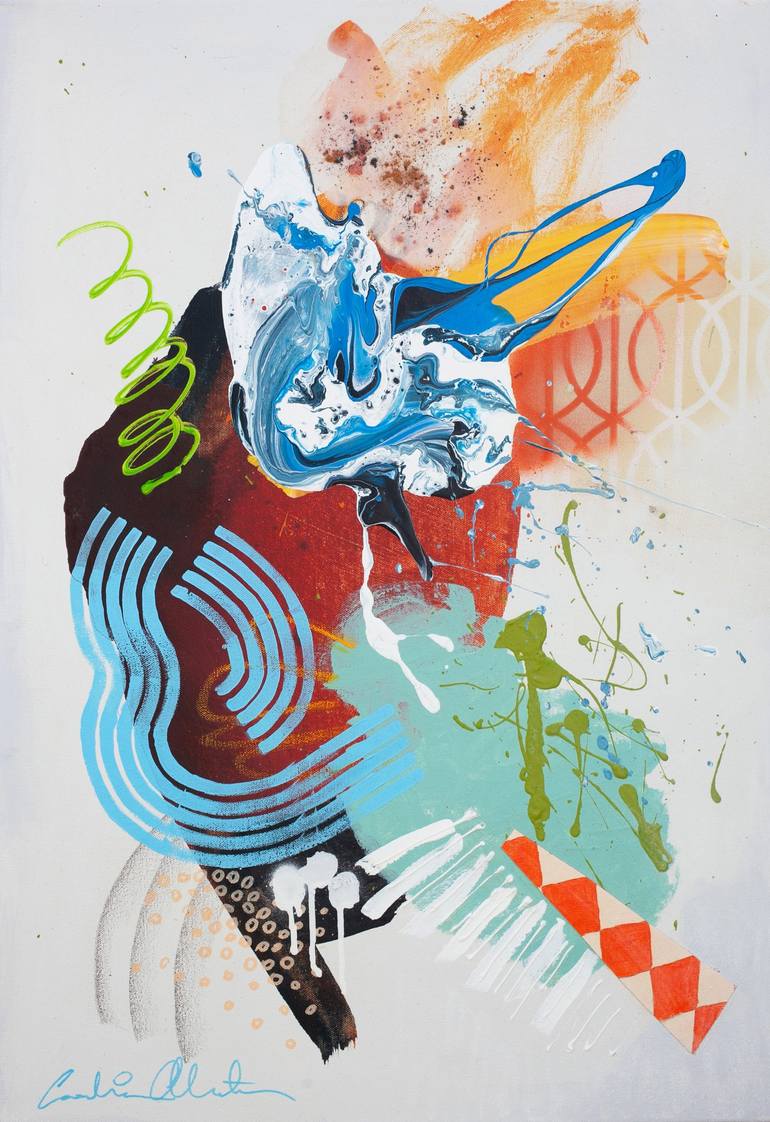The paintings of Swedish born, Cyprus-based abstract painter Carolina Alotus (b. 1970) are luminous, fantastical arenas in which beauty and harmony negotiate fiercely with chaos. Her compositions are active and energetic, sparking visual tension from unexpected relationships between colors, forms and textures, and from the feverish juxtaposition of seemingly disparate mediums and techniques. “As an abstract artist, my work is a continuous exploration of emotion, movement, and the intangible forces that shape human experience. Created through a deeply intuitive process, my paintings emerge organically, guided by instinct rather than predetermined outcomes. I embrace spontaneity, allowing color, texture, and form to interact freely, resulting in compositions that feel both raw and deliberate. My art is not merely a visual expression but an invitation—an open-ended dialogue where each viewer finds their own meaning and emotional resonance.”