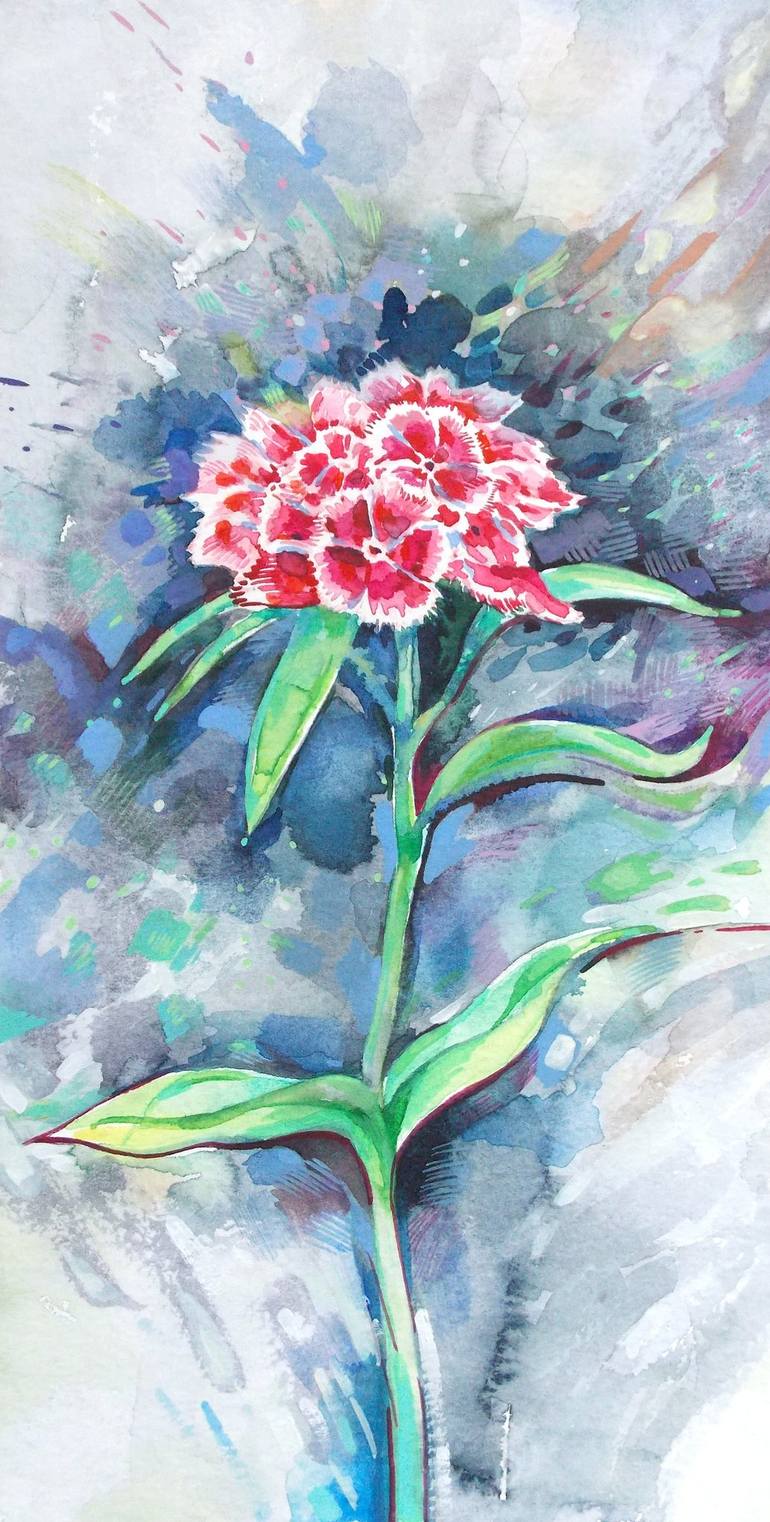 End-of-summer portrait of a stalk of "sweet William" red carnation that has flowered.