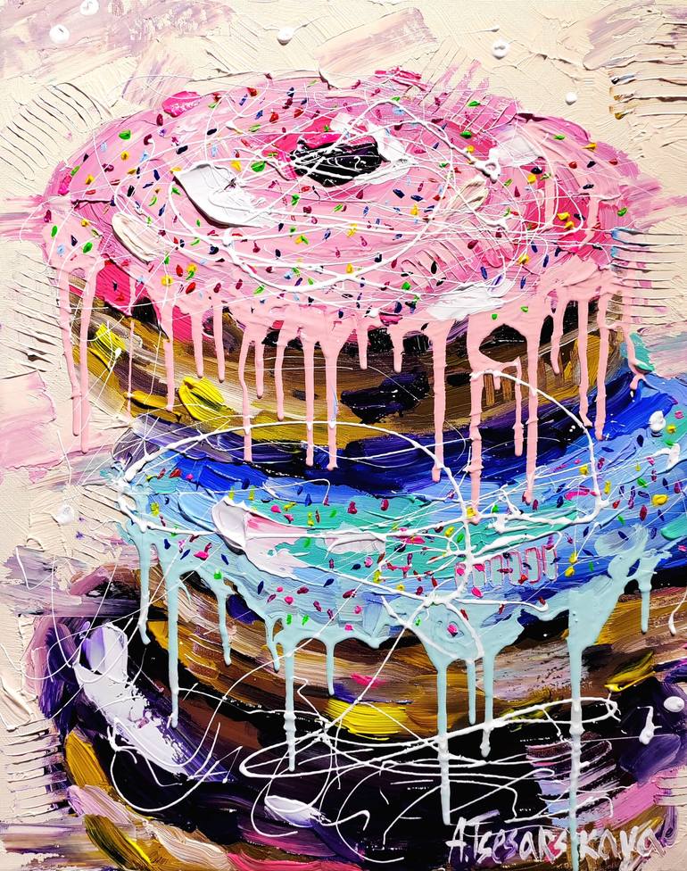 very sweet artwork, colorful Donuts, perfect for the kitchen or dining room. About this painting: -This is an original acrylic painting on stretched canvas -The painting is stretched on wooden bars -Colors: white, rose, red, violet, blue, yellow The sides are painted, there is no need to frame it. E...