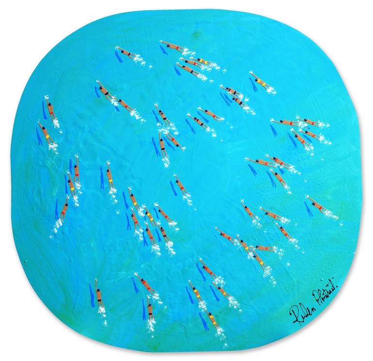 SWIMMERS Like every day, I woke up at six in the morning, although today is a special day. I am painting an artwork that I will give to my daughter on her next birthday. I draw swimmers, and paint their bodies as seen from a very high cliff and there is always one swimmer of the group that clearly ...
