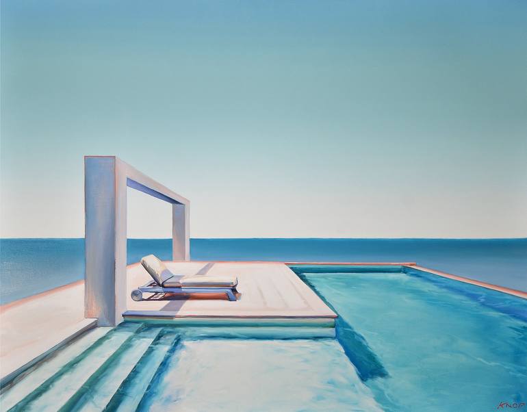 Rafal Knop - born in 1970 r. in Zywiec Poland. Rafał Knop is a painter, passionate about the art of antiquity and surrealism, who loves Tuscany. For several years, he has divided his time between Poland and Tuscany, where every year he organizes artistic Plein-Airs for amateur and professional artists and and Residenza d'Arte. A painter who in his paintings transforms the tendencies of the era - hasty, thoughtless and bright, in which reality becomes an imitation and a pretense. Drawing directly from commercialized culture (swimming pool as an indicator of luxury and a symbol of escapism), it goes beyond its borders, expressing the desire for silence. His paintings are idyllic shots of women's bodies, minimalistic captures of props such as a lonely palm or an unfurled umbrella, but also sublimated, futuristic architecture with elements of huge windows, labyrinths, stairs leading to nowhere, and finally furniture - empty tables, chaise longues and chairs (the presence of the absent) . The aura of the works is created by their light and colors, maintained in shades of ultramarine, pale purples, whites and powdery roses. The immobility of these irrationally sensual performances remains in the memory for a long time, evoking extreme emotions and turning the obvious into the non-obvious. The Swimming Pool series was inspired by the style of the 1960s-70s, the atmosphere of Edward Hockney's paintings from the L.A. series. Swimming Pool and, above all, feminine beauty.