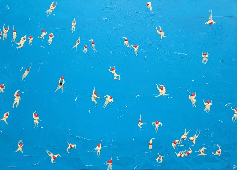 People swimming in the blue sea - a modern, semi-abstract, cheerful image that many of us have in mind when we think of summer and holidays. Or also an allegory for life: Everyone is looking for their own way in the waves, but basically we are all more similar than we would like to admit and are mo...